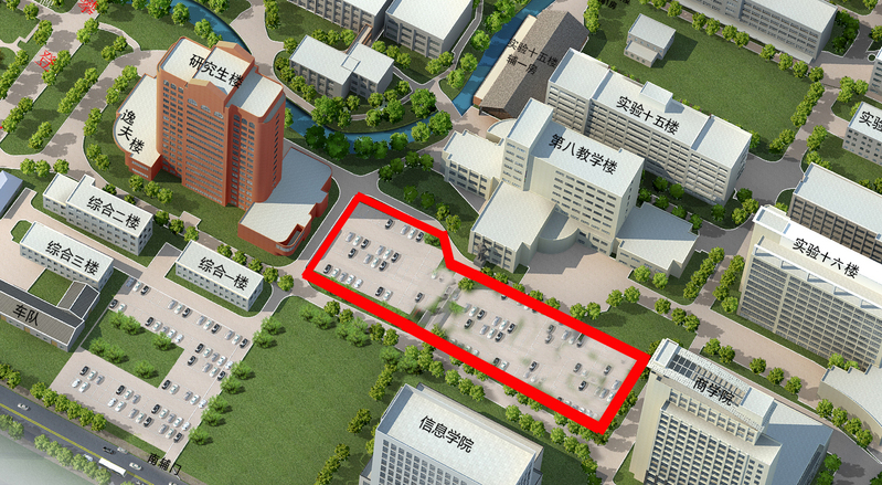 二、八教南侧停车场(下图红色区域)将作为校庆大会专用停车场,该停车场于10月28日至10月29日暂停开放使用,请停放在八教南侧停车场的车辆务必于10月27日20:00前驶离停车场。